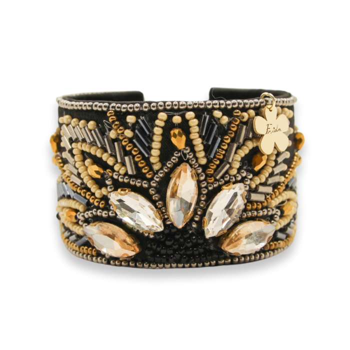 i bracciali frida, ispirati all'artista messicana frida kahlo, sono veri e propri capolavori artigianali che catturano l'essenza e lo spirito vibrante dell'iconica pittrice. ogni bracciale ha un diametro di 6 cm e un'altezza di 4 cm, dimensioni che lo rendono un accessorio significativo ma confortevole da indossare. il rivestimento interno del bracciale è anallergico e privo di nichel, garantendo comfort e sicurezza anche per le pelli più sensibili. il tessuto anallergico utilizzato aggiunge ulteriore protezione, assicurando che il bracciale sia piacevole da indossare per lunghi periodi. ogni bracciale presenta un ciondolo dorato con il logo "frida", un dettaglio distintivo che aggiunge un tocco di eleganza e autenticità. diametro bracciale 6 cm altezza bracciale 4 cm rivestimento interno anallergico nikel free realizzato a mano con pietre sintetiche quarzi idrotermali tessuto anallergico pailettes logo frida pendente dorato