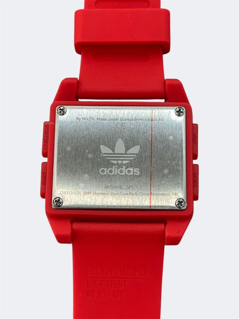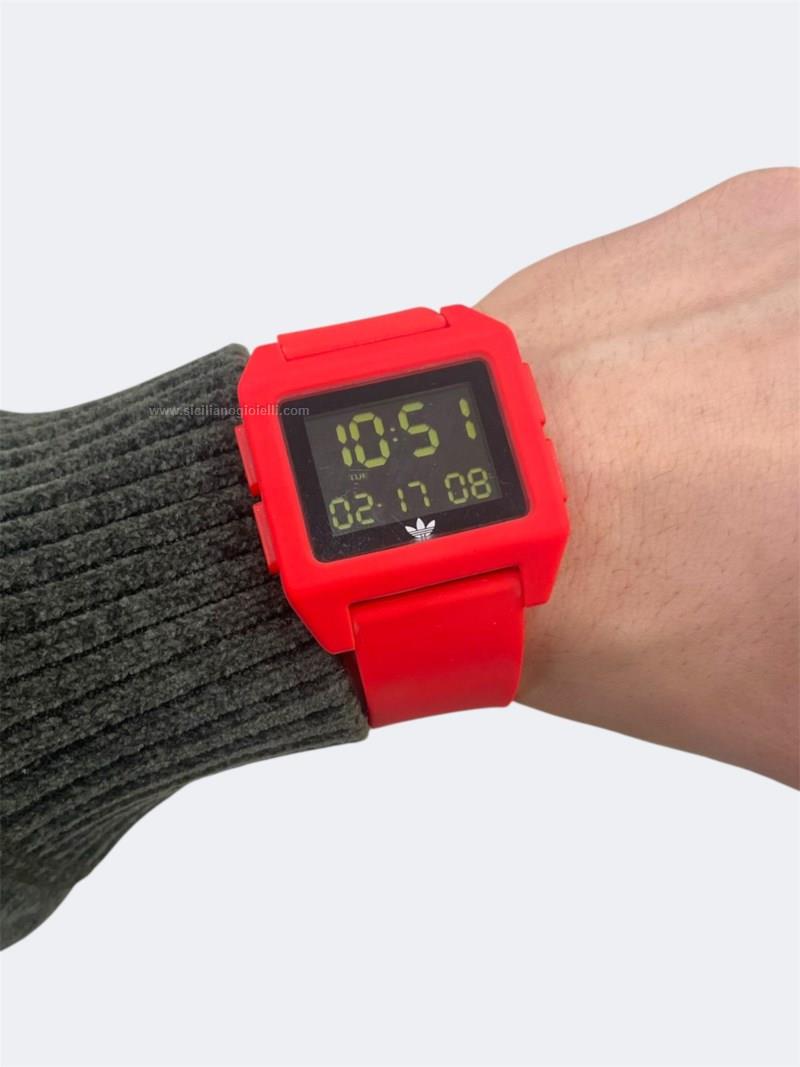 orologio adidas rosso, cinturino in gomma e quadrante digitale.